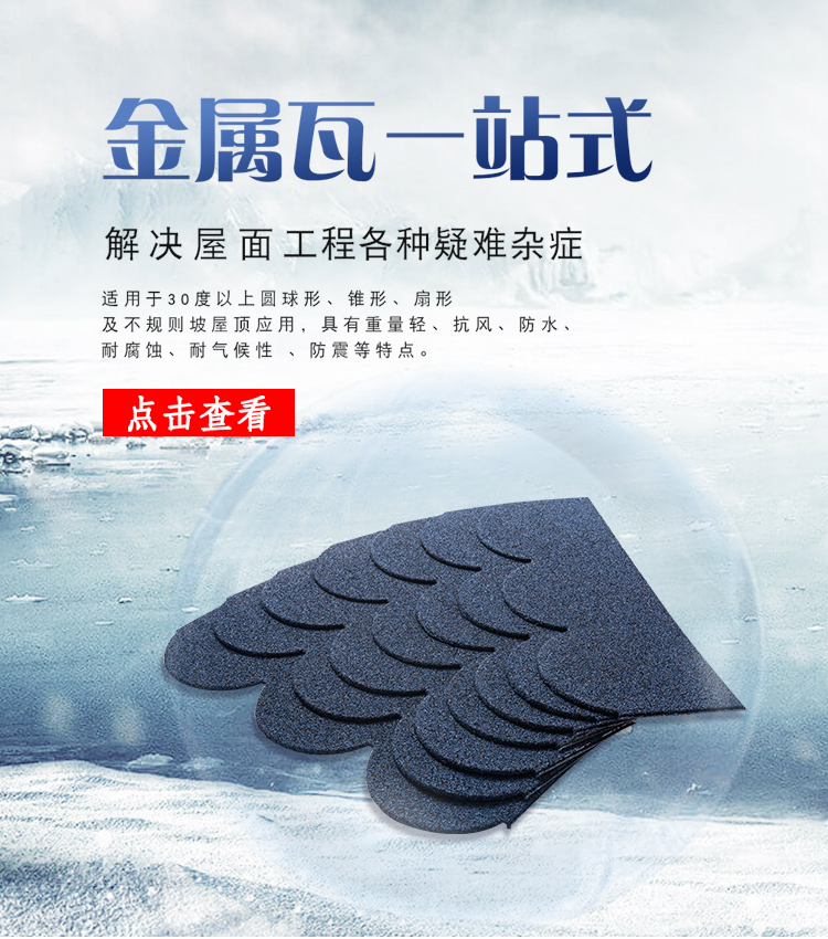 The surface of the metal fish scale tile has a conical convexity, high-grade and elegant, with a modern sense in the retro, elegant and subtle, delicate and natural, and strong in three-dimensional. Suitable for applications with spherical, conical, fan-shaped and irregularly sloping roofs above 30°